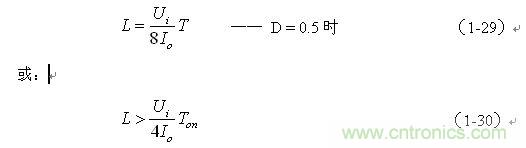 (1-29)和(1-30)式,就是計(jì)算反轉(zhuǎn)式串聯(lián)開(kāi)關(guān)電源中儲(chǔ)能電感的公式。同理,(1-29)和(1-30)式的計(jì)算結(jié)果,只給出了計(jì)算反轉(zhuǎn)式串聯(lián)開(kāi)關(guān)電源儲(chǔ)能電感L的中間值,或平均值,由于輸出電流的不確定性,實(shí)際應(yīng)用時(shí),可以以此為極限,在此平均值的計(jì)算結(jié)果上再乘以一個(gè)大于1的系數(shù)。