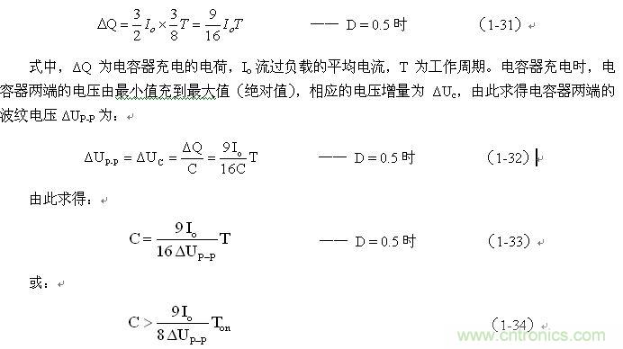 (1-33)和(1-34)式,就是計(jì)算反轉(zhuǎn)式串聯(lián)開(kāi)關(guān)電源儲(chǔ)能濾波電容的公式(D = 0.5時(shí))。式中:Io是流過(guò)負(fù)載電流的平均值,T為開(kāi)關(guān)工作周期,ΔUP-P為濾波輸出電壓的波紋。一般波紋電壓都是取峰-峰值,因此,當(dāng)D = 0.5時(shí),波紋電壓正好等于電容器充電的電壓增量,即:ΔUP-P = ΔUc 。