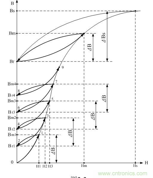 (2-9)式中,ΔB為磁感應(yīng)強(qiáng)度增量。由于輸入脈沖的幅度U和寬度τ分別與磁感應(yīng)強(qiáng)度增量ΔB和磁場強(qiáng)度增量ΔH的大小相對應(yīng),只要作用于開關(guān)變壓器線圈上的脈沖電壓的幅度U和脈沖寬度τ不變,則流過變壓器次級線圈回路中的電流也不變,這只是在導(dǎo)磁率為常數(shù)的情況下;但由于導(dǎo)磁率不是一個常數(shù),即變壓器鐵芯磁化曲線的非線性,致使經(jīng)過若干個脈沖序列之后,開關(guān)變壓器鐵芯中的最大磁感應(yīng)強(qiáng)度 和剩磁 就會相對穩(wěn)定在某個值上。此時剩磁 對應(yīng)每個輸入直流脈沖的起點(diǎn)(0電壓),而最大磁感應(yīng)強(qiáng)度 對應(yīng)每個直流脈沖的終點(diǎn)(電壓最大值)。