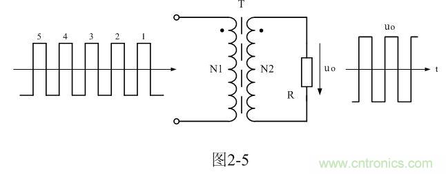 為了簡(jiǎn)單起見,我們把雙激式變壓器開關(guān)電源等效成如圖2-5所示電路。圖2-5與圖2-1所示電路的不同之處在于,圖2-1輸入電壓是直流脈沖方波,而圖2-5輸入電壓是交流脈沖電壓方波。因此,圖2-5所示電路與一般的變壓器電路在工作原理上沒有根本的區(qū)別。