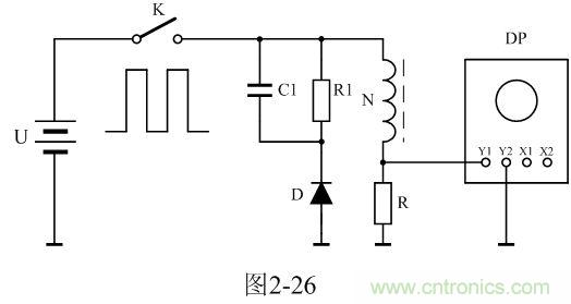圖2-26中,U是電源電壓,通過控制開關(guān)K不斷地接通和關(guān)斷,就可以把電源電壓調(diào)制成單極性電壓脈沖;N為變壓器初級(jí)線圈,D為反激輸出整流二極管;R1為反激輸出負(fù)載電阻;C1為濾波電容;R為取樣電阻,通過測(cè)量R兩端的電壓,就可以知道流過變壓器初級(jí)線圈的電流;取樣電壓被送到示波器DP進(jìn)行顯示。