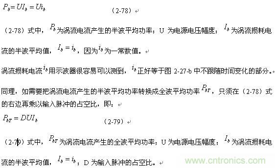 順便指出:(2-79)式的結(jié)果,是認(rèn)為渦流損耗在t1-t2期間(圖2-27-b)完全等于0而求得的,但實(shí)際上,在t1-t2期間變壓器初級(jí)線圈產(chǎn)生的反電動(dòng)勢(shì)同樣也會(huì)在變壓器鐵芯中感應(yīng)產(chǎn)生渦流損耗電流,即當(dāng)輸入電壓為0時(shí)刻,在變壓器鐵芯中還存在很短暫時(shí)間的渦流損耗;由于這種渦流損耗是由反電動(dòng)勢(shì)提供能量來維持的,它將隨著反電動(dòng)勢(shì)能量的衰減很快就衰減到0。