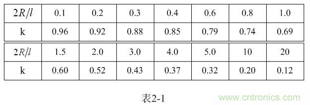 【說明】上式是用來計(jì)算多層線圈繞組、截面為圓形的空心線圈的電感計(jì)算公式。長岡系數(shù)k可查閱表2-1,系數(shù)c可查閱表2-2。當(dāng)線圈內(nèi)部有鐵芯時,有鐵芯線圈的電感是空心線圈電感的
