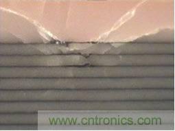 如圖3所示,斷裂通常沿著一層或兩層介質層貫穿整個電容的中部。大多數的解決方案是將多個電容器通過添加引腳進行疊加,從而在給定尺寸下提高容值,但這需 要消耗大量人力,花費較多成本,并會產生可靠性問題。另外的解決方案使用特殊電介質配方,但同時以犧牲介電常數作為代價,并影響最終可獲得的容值大小。