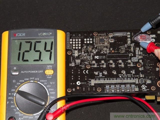 焊接完成后一是要用放大鏡配合電路圖仔細的測量各個元器件之間的連接關系,確定有無短路和虛焊。另外一個簡單的辦法就是通過直接測量供電回路的電阻值(關機狀態下)來確定是否有明顯的焊接失誤。通常來說GPU核心供電回路的電阻值在1歐姆到10幾歐姆之間,而顯存供電回路則是100-140歐姆左右。至于測量點,選擇核心和顯存供電模塊輸出電容的兩個引腳就可以了??梢钥吹礁脑烨昂蠛诵?、顯存供電回路的電阻值都在4.8歐/125歐左右,因此焊接是沒有問題的。