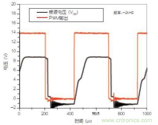 可以看到,盡管toff足夠快,但ton仍約為80μs。對于許多開關(guān)應(yīng)用來說,這個開啟過程是較慢的。若將開關(guān)頻率設(shè)置為2kHz,應(yīng)該不會導(dǎo)致太多開關(guān)損耗,對于PWM占空比較大的負(fù)載條件來說更是如此。
