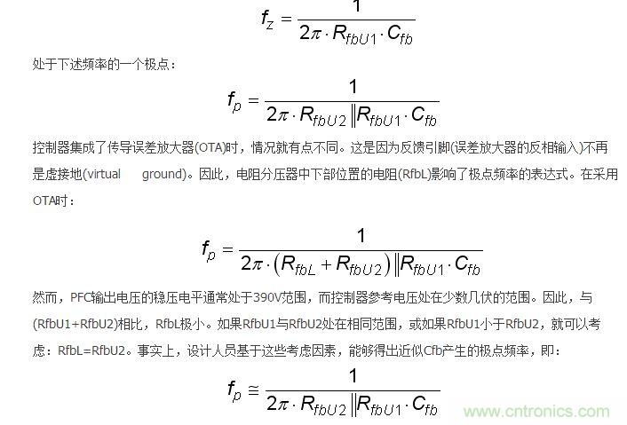 如果RfbU1與RfbU2處在相同范圍,低頻增益就略微增加,交越頻率就跟隨fp與fz的相同比率增加。如果與RfbU2相比RfbU1極小,我們就獲得在控制至輸出傳遞函數中抵消(cancel)的極點和零點。這樣,增加Cfb就對環路和交越頻率沒有影響。事實上,特別是在RfbL=RfbU2時,這個增加的電容并不會大幅改變PFC段的動態性能。