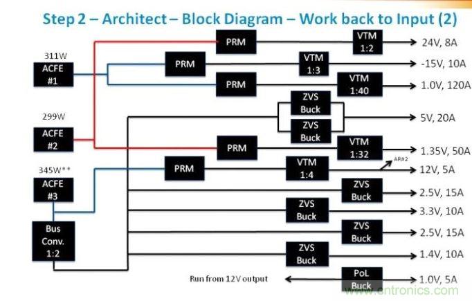 構(gòu)建系統(tǒng)的第一個(gè)步驟是創(chuàng)建一個(gè)電源系統(tǒng)的方框圖,從輸出開始,然后向輸入后向推進(jìn)。從最低功率級別開始它的運(yùn)作更好,并從那里繼續(xù)工作,以便可以審查功率元件類別,并隨功率級別的增加在必要時(shí)做出改變。