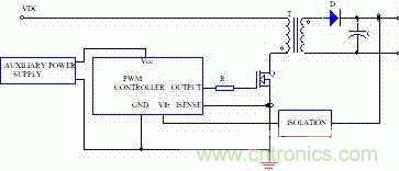 輔助電源的設計不但影響到整個電源的體積、效率、穩定性、可靠性和成本,而且還將影響到整個開關電源的設計策略。一個重要的原因就是隔離問題。例如在離線式開關電源中,如果其內部的輔助電源和功率主回路輸入共地,那么就需要用光耦或變壓器來對輸出電壓采樣信號進行隔離,見圖1。而如果是內部輔助電源和功率主電路輸出共地,則一般不需要對電壓采樣信號隔離,這時只需對驅動信號隔離。