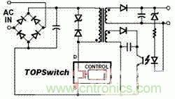 第四種方法:用單片電源芯片,如Topswitch或Tinyswtich系列芯片,可以方便的做成高性能小功率的輔助電源。圖5是topswitch 芯片在單端反激式單片開關電源中的典型應用。