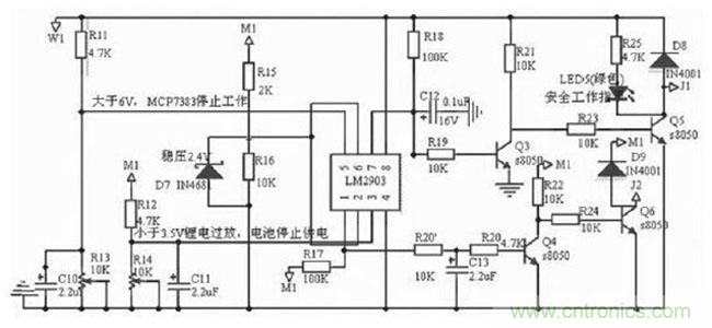 當鋰電池電壓低于315V 時,即電池電量釋放92%以上時,認為不能繼續放電,否則鋰電池內部介質會發生變化,致使充電特性變壞,容量降低等。為此設計過放電保護控制電路,此電路的具體設計如圖3,分析如下:采用了LM 2903的1,2,3 腳組成的一路比較器,與外圍器件構成過放電壓比較器,R12 , R14分壓后接至LM 2093 的3 腳。當電壓值小于315V 時,分壓值小于214V,LM 2903的1 腳由高電平轉變為低電平, Q4 由導通轉變為截止狀態, Q6 飽和導通,JDQ2 工作,同時過放紅色指示燈亮。
