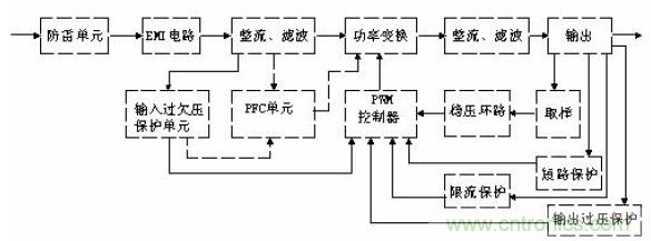 開(kāi)關(guān)電源的主要電路是由輸入電磁干擾濾波器(EMI)、整流濾波電路、功率變換電路、PWM控制器電路、輸出整流濾波電路組成。輔助電路有輸入過(guò)欠壓保護(hù)電路、輸出過(guò)欠壓保護(hù)電路、輸出過(guò)流保護(hù)電路、輸出短路保護(hù)電路等。開(kāi)關(guān)電源的電路組成方框圖如下: