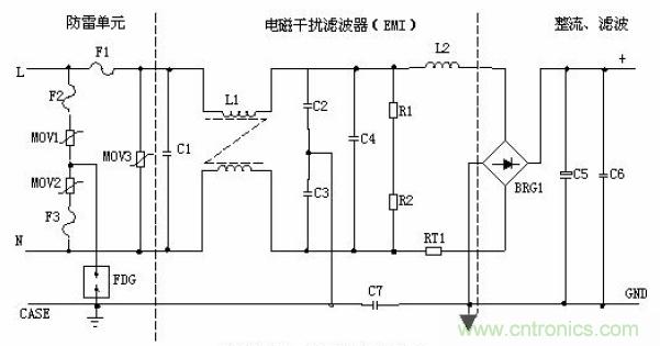 ① 輸入濾波電路:C1、L1、C2組成的雙π型濾波網(wǎng)絡(luò)主要是對(duì)輸入電源的電磁噪聲及雜波信號(hào)進(jìn)行抑制,防止對(duì)電源干擾,同時(shí)也防止電源本身產(chǎn)生的高頻雜波對(duì)電網(wǎng)干擾。C3、C4為安規(guī)電容,L2、L3為差模電感。