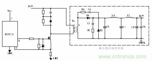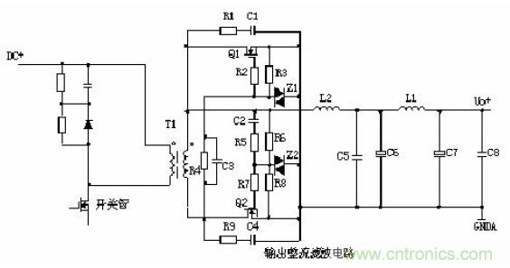 T1為開(kāi)關(guān)變壓器,其初極和次極的相位同相。D1為整流二極管,D2為續(xù)流二極管,R1、C1、R2、C2為削尖峰電路。L1為續(xù)流電感,C4、L2、C5組成π型濾波器。