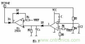取樣電壓分為兩路,一路經(jīng)R1、R2、R3、R4分壓后輸入比較器3腳,如取樣電壓高于2腳基準(zhǔn)電壓,比較器1腳輸出高電平去控制主控制器使其關(guān)斷,電源無(wú)輸出。另一路經(jīng)R7、R8、R9、R10分壓后輸入比較器6腳,如取樣電壓低于5腳基準(zhǔn)電壓,比較器7腳輸出高電平去控制主控制器使其關(guān)斷,電源無(wú)輸出。