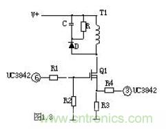 R4、C3、R5、R6、C4、D1、D2組成緩沖器,和開(kāi)關(guān)MOS管并接,使開(kāi)關(guān)管電壓應(yīng)力減少,EMI減少,不發(fā)生二次擊穿。在開(kāi)關(guān)管Q1關(guān)斷時(shí),變壓器的原邊線圈易產(chǎn)生尖峰電壓和尖峰電流,這些元件組合一起,能很好地吸收尖峰電壓和電流。從R3測(cè)得的電流峰值信號(hào)參與當(dāng)前工作周波的占空比控制,因此是當(dāng)前工作周波的電流限制。當(dāng)R5上的電壓達(dá)到1V時(shí),UC3842停止工作,開(kāi)關(guān)管Q1立即關(guān)斷。