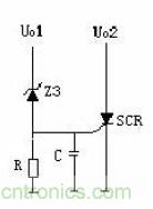 如上圖,當(dāng)Uo1輸出升高,穩(wěn)壓管(Z3)擊穿導(dǎo)通,可控硅(SCR1)的控制端得到觸發(fā)電壓,因此可控硅導(dǎo)通。Uo2電壓對(duì)地短路,過(guò)流保護(hù)電路或短路保護(hù)電路就會(huì)工作,停止整個(gè)電源電路的工作。當(dāng)輸出過(guò)壓現(xiàn)象排除,可控硅的控制端觸發(fā)電壓通過(guò)R對(duì)地泄放,可控硅恢復(fù)斷開(kāi)狀態(tài)。