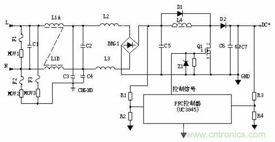 輸入電壓經(jīng)L1、L2、L3等組成的EMI濾波器,BRG1整流一路送PFC電感,另一路經(jīng)R1、R2分壓后送入PFC控制器作為輸入電壓的取樣,用以調(diào)整控制信號(hào)的占空比,即改變Q1的導(dǎo)通和關(guān)斷時(shí)間,穩(wěn)定PFC輸出電壓。L4是PFC電感,它在Q1導(dǎo)通時(shí)儲(chǔ)存能量,在