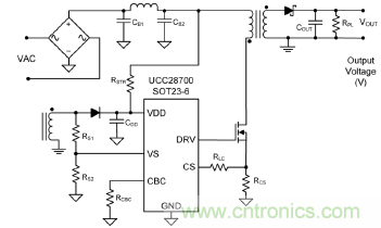 UCC28700是一款恒壓、恒流反激式控制器,無需使用光耦合器便可實(shí)現(xiàn)一次側(cè)穩(wěn)壓。圖1是UCC28700的應(yīng)用電路。
