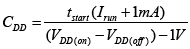 在啟動(dòng)開始時(shí),輸出電容器的平均充電電流為正值,充電電流等于(IS-IL),如等式1所示。在VO上升至VOCC之前,輔助匝電壓低于VDD,此時(shí)CDD無法通過輔助匝充電。但在此期間,CDD會(huì)被Irun和柵極驅(qū)動(dòng)電流放電。如果 VDD低于VDD(off),UCC28700器件就會(huì)關(guān)斷。為確保器件順利啟動(dòng),在ta內(nèi)VDD必須大于VDD(off)。在等式8和等式9中,應(yīng)用了一個(gè)臨界條件。Tstart是VO從0上升至VOCC的時(shí)間。等式2是VOCC和VDD(off)的關(guān)系。在等式8 中,有1mA的估計(jì)柵極驅(qū)動(dòng)電流,而且為VDD添加了1V的裕度。VCST是芯片選擇閾值電壓。在啟動(dòng)開始時(shí),UCC28700 VS引腳上的電壓為低,因此VCST保持其最大值。