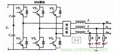 圖1是逆變電路的構成。由蓄電池提供的直流電通過三相逆變電路變為交流電,其基波頻率是逆變電源的輸出頻率,該交流信號經過輸出變壓器隔離,再由低通濾波器濾去諧波,獲得負載所需的三相正弦交流電。