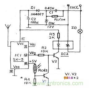 IC1是一只SX-3型人體接近開(kāi)關(guān)集成電路模塊,該器件最大探測(cè)距離可達(dá)10米。其中紅線接正電源端,黑線接公共端,黃線為+5v電源輸出端,供外部使用,藍(lán)線為即時(shí)開(kāi)關(guān)信號(hào)輸出端(本電路不用),綠線為具有時(shí)間累積功能的延時(shí)開(kāi)關(guān)信號(hào)輸出端。220V市電由C1降壓、D1整流、C2濾波、DW穩(wěn)壓后為控制電路提供12V直流電源。平時(shí),沒(méi)有人接近IC1或當(dāng)行人很快從報(bào)欄前經(jīng)過(guò)時(shí),IC1的VO2端輸出低電平,后級(jí)電路不動(dòng)作,燈不亮。當(dāng)有人要看報(bào)在報(bào)欄前停頓數(shù)秒后,IC1的V02端輸出高電平。白天時(shí),光敏電阻Rcds為低阻值,V1導(dǎo)通,V2截止,后級(jí)電路仍不能工作。晚聞Rcds為高阻值,V1截止,的高電平使V2導(dǎo)通,光電耦合器IC2內(nèi)藏發(fā)光二極管發(fā)光,光敏可控硅開(kāi)通,燈泡ZD發(fā)光。閱報(bào)者離開(kāi)后,IC1V02端又變?yōu)榈碗娖剑琙D自動(dòng)熄滅。