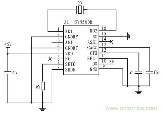 無(wú)線接收部分主要由解碼芯片SYN500R、晶振和外圍電路組成超外差接收模塊,接收模塊負(fù)責(zé)接收來(lái)自發(fā)送模塊的編碼,然后將編碼交由處理器處理,處理器處理后通過(guò)放大器將信號(hào)放大,然后控制繼電器的開(kāi)和合,接收部分電路圖如圖4所示。