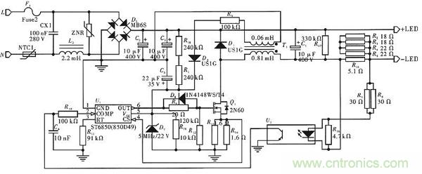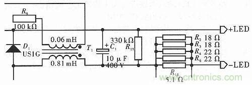 如圖2所示,此電路通過變壓器輸出適當(dāng)?shù)碾娏鳎?dāng)有LED負(fù)載時(shí),電路中通入適當(dāng)?shù)碾娏骱皖l率使LED正常工作;當(dāng)沒有負(fù)載時(shí),變壓器中仍然殘留有能量,需要釋放。此時(shí)由R17等構(gòu)成的回路,可以慢慢地釋放變壓器中的電能。但當(dāng)電流突然減小時(shí),變壓器中會(huì)產(chǎn)生感應(yīng)電動(dòng)勢,由此會(huì)產(chǎn)生較高的反向電壓,可能會(huì)擊穿器件。為了克服這個(gè)問題,在線圈的兩端并聯(lián)一個(gè)續(xù)流二極管D1,同時(shí)在電路輸出端串聯(lián)R15,并且在R15兩端并聯(lián)R2,R3,R4,R6。R15有降壓作用,并且能為反饋電路提供電壓。由于R15承受的功率較大,容易燒壞,所以預(yù)備一個(gè)由R2,R3,R4和R6的并聯(lián)等效電阻,這樣每個(gè)電阻承受的功率變小,在增加使用壽命的同時(shí),能夠減少維修費(fèi)用。