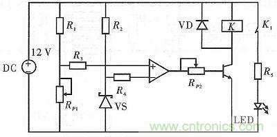 合理的蓄電池充放電,不僅可以延長蓄電池壽命,且能提升整個(gè)電路系統(tǒng)的穩(wěn)定性。因此需要設(shè)計(jì)保護(hù)電路,以保證蓄電池能在一定的電壓范圍內(nèi)進(jìn)行充放電。本項(xiàng)目使用3級級聯(lián)的12 V鉛酸蓄電池。由于過充電路與過放電路有相似性,本文只給出蓄電池的過放電路,如圖5所示。電源電壓正常時(shí),調(diào)節(jié)電位器RP1使放大器的同相輸入端的電位略高于反相輸入端的電位,此時(shí)放大器輸出低電平,VT截止,電路正常工作。當(dāng)電源電壓<10.5 V時(shí),反相輸入端的電位大于同相輸入端的電位,放大器會(huì)輸出高電平,調(diào)節(jié)RP2,使VT導(dǎo)通,此時(shí)負(fù)載與電源斷開。