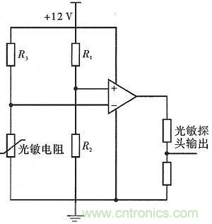 其由光電轉(zhuǎn)換模塊和光敏電阻組成。光電轉(zhuǎn)換由比較器來實(shí)現(xiàn)。當(dāng)光敏探頭感應(yīng)的光照強(qiáng)度不強(qiáng)時(shí),比較器會(huì)輸出高電位,否則輸出低電位。具體電路如圖6所示。R1分擔(dān)電路電壓,依照外界環(huán)境條件,選擇適當(dāng)?shù)碾娮鑂2,控制比較器中正相輸入的電壓值,使其作為比較器工作的參考電壓;R3起到保護(hù)光敏電阻以及分壓的作用。光敏電阻的阻值隨著外界光強(qiáng)的變化而變化,這樣就可將光信號變換成電壓信號,以此作為信號電壓連接到比較器的反相輸入端。比較兩個(gè)輸入端的電壓大小。若信號電壓較小,比較器輸出高電平,否則比較器輸出低電平。從而實(shí)現(xiàn)在明亮條件下輸出低電平,在黑暗條件下輸出高電平的設(shè)計(jì)要求。