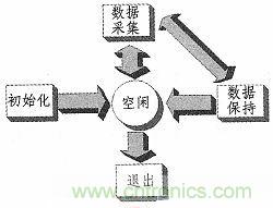 系統有初始化、空閑、運行、保持及退出5個狀態。其狀態轉換如圖1所示。系統啟動時進入初始化狀態,加載上次用戶的設置參數后進入空閑狀態,等待用戶的按鈕操作。在空閑狀態下系統的輔助功能“數據管理”與“故障診斷”可以使用,同時可以配置用戶參數。空閑狀態下點擊“運行”按鈕,進入運行狀態,這時數據采集卡開始采集數據,系統處理計算后顯示在窗口中。運行狀態下點擊“停止”,系統返回到空閑狀態。如果點擊“保持”狀態,這時系統停止采集,可以進行數據保存操作,保存停止采集前一時刻的所有數據和設置。系統后臺進一步可對保存的數據進行計算分析。