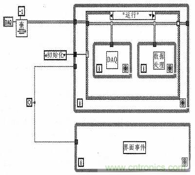 圖4是測試系統軟件的總體架構。其主要要點是:用while循環實現系統狀態機,用事件結構監控界面按鈕事件(用戶點擊各種按鈕)和用戶自定義事件,上述2者用事件進行同步,在狀態機的“運行子狀態”中,用隊列同步數據采集和數據處理顯示。