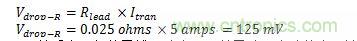 以一個具有25A供電,伴有5A瞬變電流的負(fù)載應(yīng)用為例。其中,電源電壓設(shè)為 2.5V,通過5英尺長的14AWG布線連接至IC測試板。由于是低電壓供電,如果電壓有超過100mV的跌落,通常是不可接受的。14AWG線每英尺的電阻為2.5mΩ,由此,在電源輸出和IC測試板之間的導(dǎo)線回路存在25mΩ電阻。根據(jù)歐姆定律,我們可以計(jì)算出導(dǎo)向回路上可能出現(xiàn)的壓降: