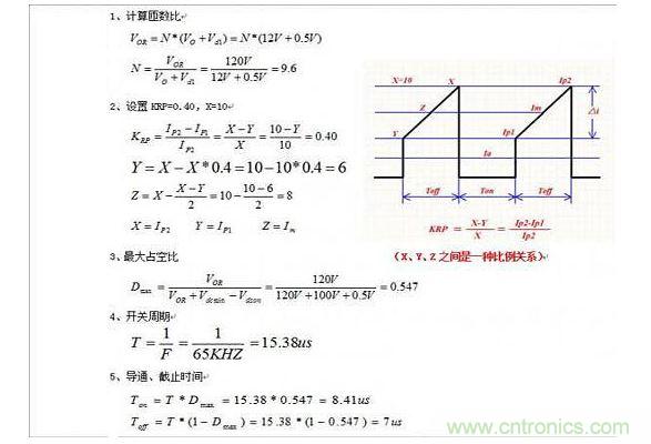 3、原邊電流的計(jì)算,其實(shí)是參考了《開(kāi)關(guān)電源手冊(cè)》,見(jiàn)p156--p180,110W反激變壓器設(shè)計(jì),原文中定義的原邊電流,IP2=3*IP1,即KRP=0.66。本文中用X、Y、Z來(lái)描述原邊電流,即固定X=10,Y為任意值,KRP也就為任意值。