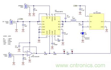 圖1顯示的是一個通過高側感測電阻器R3直接驅動LED中電流的降壓轉換器,TPS54218,同步降壓控制器。這個電流感測電壓被電流感測監(jiān)視器,INA193,放大20倍,這樣可顯著地降低R3中的功率耗散并提升效率。分流監(jiān)視器的電流反饋信號輸出給電阻分壓器 (R6/R8),這形成了到VSENSE的完整反饋路徑。