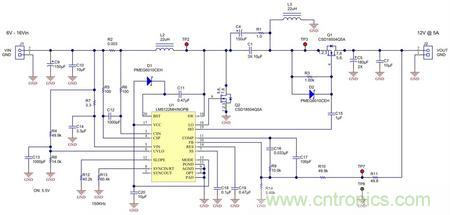 圖3用LM5122同步升壓型控制器實現了同步SEPIC轉換器。它允許使用一個N通道的金屬氧化物半導體場效應晶體管(MOSFET)(Q1)來替換二極管D1,從而能降低損耗或在損耗相同的情況下允許更多的輸出電流。