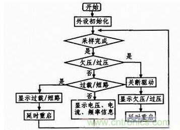 系統(tǒng)上電后,首先完成各個外設(shè)的初始化,主要包括系統(tǒng)時鐘、定時器、GPIO口、ADC、DMA、中斷及SPI的初始化。在此,定時器和中斷一旦初始化完成,PWM及SPWM波就會生成。考慮到過流、短路保護(hù)及反饋穩(wěn)壓的實(shí)時性要求較高,故在中斷內(nèi)完成。欠壓、過壓對實(shí)時性要求低,放在主程序內(nèi)。為提升系統(tǒng)的性能,ADC采樣使用DMA方式傳輸數(shù)據(jù),傳輸完成后,發(fā)出中斷申請,對采集到的數(shù)據(jù)進(jìn)行簡單濾波處理,其他功能函數(shù)調(diào)用此數(shù)據(jù)完成相應(yīng)的保護(hù)及穩(wěn)壓功能。主程序的流程圖如圖6所示。