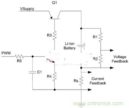 電流控制電路可采用電壓源和電流反饋技術(shù)進(jìn)行構(gòu)建。其工作原理類似于典型的負(fù)反饋控制系統(tǒng)。允許充電電流通過小電阻以獲得反饋,從而產(chǎn)生一定的電壓。