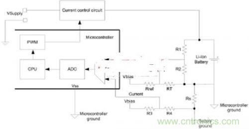 電池負(fù)端可作為微控制器接地,這就讓電壓、溫度和電流反饋可參考微控制器接地,并能進(jìn)行單端ADC測(cè)量。對(duì)于電流反饋而言,正偏移電壓需要引入,而反饋電壓在電池充電時(shí)將為負(fù)。如圖5所示,電阻R3和R4提供了所需的偏移電壓。