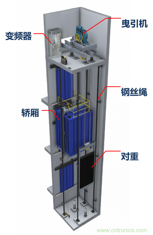 傳統(tǒng)電梯的動力部分主要由曳引機(jī)(卷揚(yáng)機(jī))、變頻器、轎廂、鋼絲繩、對重組成。曳引機(jī)通過卷動鋼絲繩,調(diào)節(jié)轎廂和對重的平衡,實(shí)現(xiàn)對轎廂高度的控制,即電梯的上下。其中曳引機(jī)本質(zhì)就是一臺由變頻器驅(qū)動與控制的大功率電機(jī),需要安置在大樓頂層——這就造成了電梯無法上頂層的問題了,因?yàn)轫攲拥碾娞菸恢帽灰芬龣C(jī)和變頻器占據(jù)了。這問題一直存在了很久的時間,因?yàn)檫^去曳引機(jī)基本都用交流異步電機(jī),且功率輕松上幾十KW,體積非常大,且不能露天放置,只能一直占著頂樓的房間。