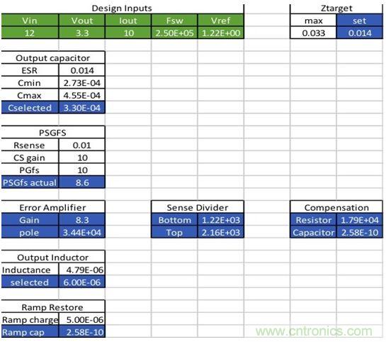 最小電容和最大電容限值也是計算出來的,而最終入選值還可供選擇,選定值再用于剩下的計算。這些覆蓋值也允許其它輸入,包括PGFS和輸出電感。重要的是,這些決定和選擇要按此順序進行。