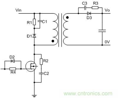 二極管在高速導通和關斷時,反向恢復期間,二極管的寄生電感和電容會產生高頻振蕩,為了抑制高頻振蕩可在二極管兩端加RC緩沖電路如圖2所示,電阻R3一般在1Ω~100Ω,電容C3一般在100pF~1nF,如果電源工作頻率較低,效率滿足要求的話,二極管D3可以選擇反向恢復時間較慢的二極管。