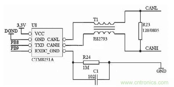 CAN-bus接口電路采用+3.3V供電,選擇CTM8251A隔離CAN收發器。該芯片是3.3V工業級的隔離CAN收發器。CTD0信號連接主控芯片的CAN控制器的發送腳,CRD0信號連接CAN控制器的接收腳。CTM隔離CAN收發器內有一完整的CAN-bus隔離收發器電路,可以將來自CAN控制器的邏輯電平轉換為CAN總線信號,并具有DC2500V隔離功能。另外,CTM收發器可以選擇集成ESD保護功能的“T”系列,從而省略外擴的ESD保護器件。共模扼流圈T1起著EMI增強的功能,用于提高設備的EMI能力;共模扼流圈T1的電感參數很重要,選擇CAN-bus專用器件,比如EPCOS的B82793扼流圈。