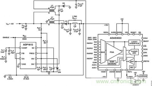 ADP1613用作單端初級(jí)原邊電感(SEPIC) Cuk轉(zhuǎn)換器,是ADAS3022在外部5 V電源供電情況下,為其提供20 mA時(shí)所需±15 V高壓電源以及最大值為3 mV的低輸出紋波的理想選擇。本應(yīng)用中,ADP1613的開關(guān)頻率為1.3MHz。如圖3所示,ADP1613盡可能地減少了外部元器件數(shù)目,并且具有超過86%的效率,因此它能滿足ADAS3022的規(guī)格要求。在該拓?fù)渲惺褂玫统杀続DP1613的最大優(yōu)勢,是它在兩條供電軌之間的出色跟蹤能力,同時(shí)使用現(xiàn)成的耦合電感可產(chǎn)生±15 V電壓。除此之外,還能通過ADIsimPower設(shè)計(jì)工具輕松快捷地完成設(shè)計(jì)制造。