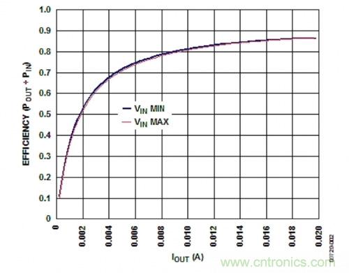 圖3. ADP1613的效率(POUT/PIN)與輸出電流(IOUT)的關(guān)系
