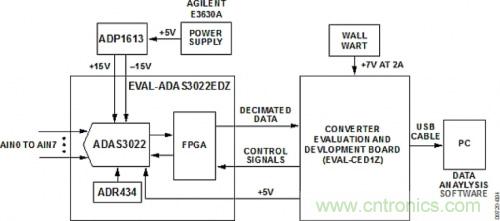 測試設(shè)置的功能框圖如圖4所示。ADP1613評(píng)估板由外部+5 V電源驅(qū)動(dòng),產(chǎn)生ADAS3022板所需的±15 V電壓。7 V直流壁式電源為EVAL-CED1Z板供電。EVAL-CED1Z板上的穩(wěn)壓器提供ADAS3022板所需的5 V電源。運(yùn)行交流測試時(shí),采用Audio Precision SYS-2702產(chǎn)生低失真輸入信號(hào)。