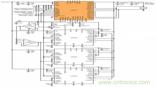 µModule DC/DC 穩(wěn)壓器可提供一種同時提供高功率輸出和 DPSM 功能的簡單和有效之方法。由于可容易地通過并聯(lián)多個 µModule 穩(wěn)壓器以提供高電流輸出 (各個通道彼此之間的電流匹配準確度標稱值在 1% 以內),從而降低了產生熱點的可能性。而且,只有其中一個 µModule 穩(wěn)壓器必需具備 DPSM 能力,原因是即使并聯(lián)的 µModule 未內置固有的 DPSM,它也能提供完整的數(shù)字接口。圖 2 示出了一個 LTM4677 (36A DPSM µModule) 與 3 個 LTM4650 (50A µModule) 相并聯(lián)的應用電路原理圖。