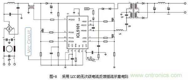 圖-8是省略次級電流采樣反饋的示意電路,工作在固定頻率,整體電路更加精簡,整機成本可以與"PFC+反激"拓撲競爭。考慮到效率等因素,整體成本甚至更低。