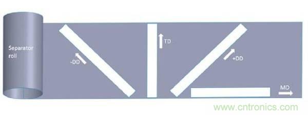 具體實驗過程如下,首先將參與測試的隔膜材料根據ASTM針對薄膜材料的D882規范的要求,制成了具有規則形狀的長條形試樣,拉伸實驗采用Instron 5944單向拉力機進行測試,拉力加載速度為25mm/min。測試結果發現,干法工藝制備的PE隔膜和三層復合隔膜在各個方向的抗拉強度上有很大的差距,例如在縱向MD上,抗拉強度>120MPa,在橫向TD和對角線方向上僅>20MPa。而濕法工藝制備的隔膜在各個方向上具有相似的抗拉強度(>140MPa),而無紡布工藝制備的隔膜的抗拉強度最差(<35MPa),無紡布隔膜在縱向和橫向具有相似的強度,但是對角線方向抗拉強度要明顯弱很多。