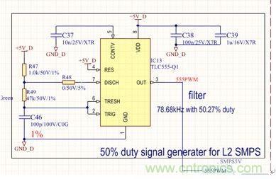 前級電源屬于典型定壓設計,無需給出設計原理,本文重點介紹后級半橋電路。具體原理圖見圖2和圖3。圖2為采用汽車級定時器電路設計的50%占空比信號發生器,用于給半橋開關電源提供控制信號,其中R49可以用來調整開關頻率,一般可以設定在70kHz到300kHz之間,頻率選擇主要根據電路板實際空間尺寸和變壓器的伏秒積進行折衷選取。